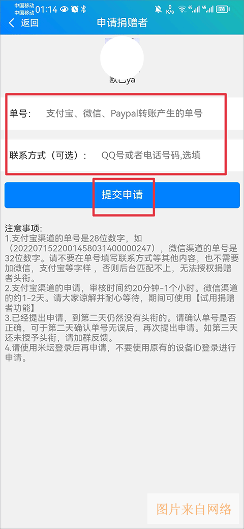 3、然后将转账产生的单号和联系方式填写完成后点击提交申请即可